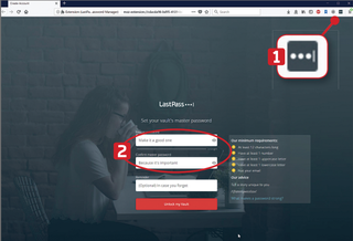 Step 1: Go to www.lastpass.com in your main browser and install the add-on. Click the new LastPass button at the top right (1) and click on 'Create an account'. Enter your email address and then enter a master password. (2) This needs to be very strong as it will be used protect your other passwords.