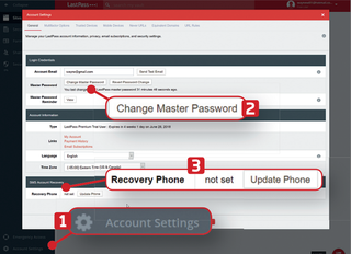 Step 3: Your vault will now open. It will be empty at the moment. Click on Account Settings (1) in the left-hand sidebar. From here you can change your master password, (2) and set up a recovery phone. (3) This will help you get back into LastPass should you ever forget your login details.